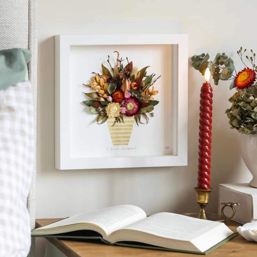 A beautiful Contemporary Floral Arrangement. Handcrafted using Irish grown, dried and preserved flowers and foliage and displayed in an Irish made wooden frame.