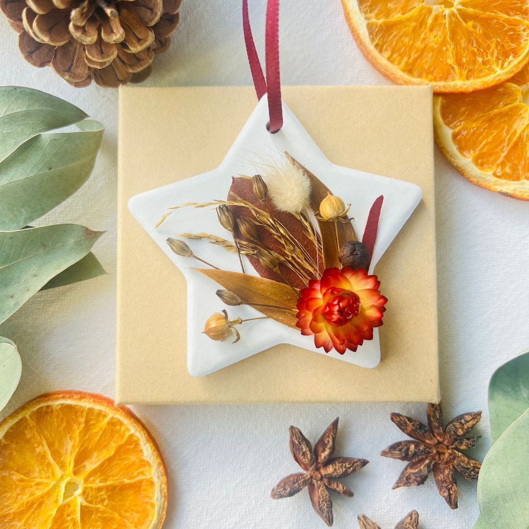 A single gorgeous ceramic Star festive decoration handcrafted with dried flower embellishment