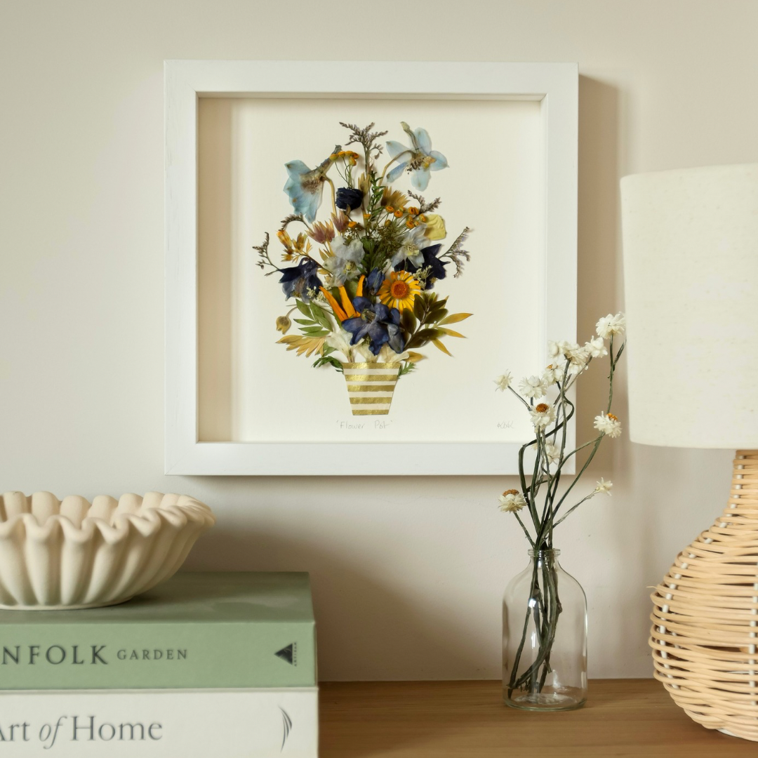 A beautiful Contemporary Floral Arrangement. Handcrafted using Irish grown, dried and preserved flowers and foliage and displayed in an Irish made wooden frame.