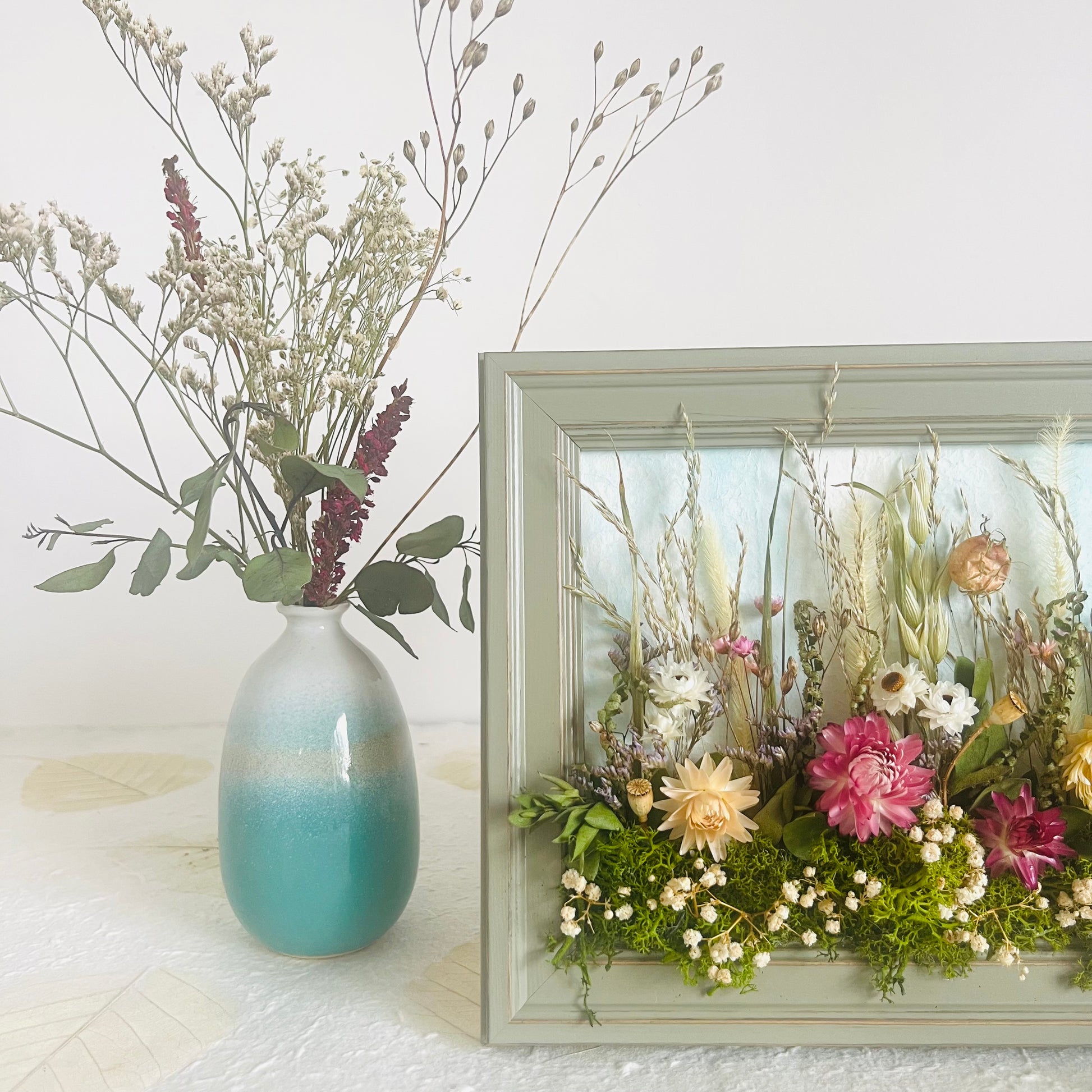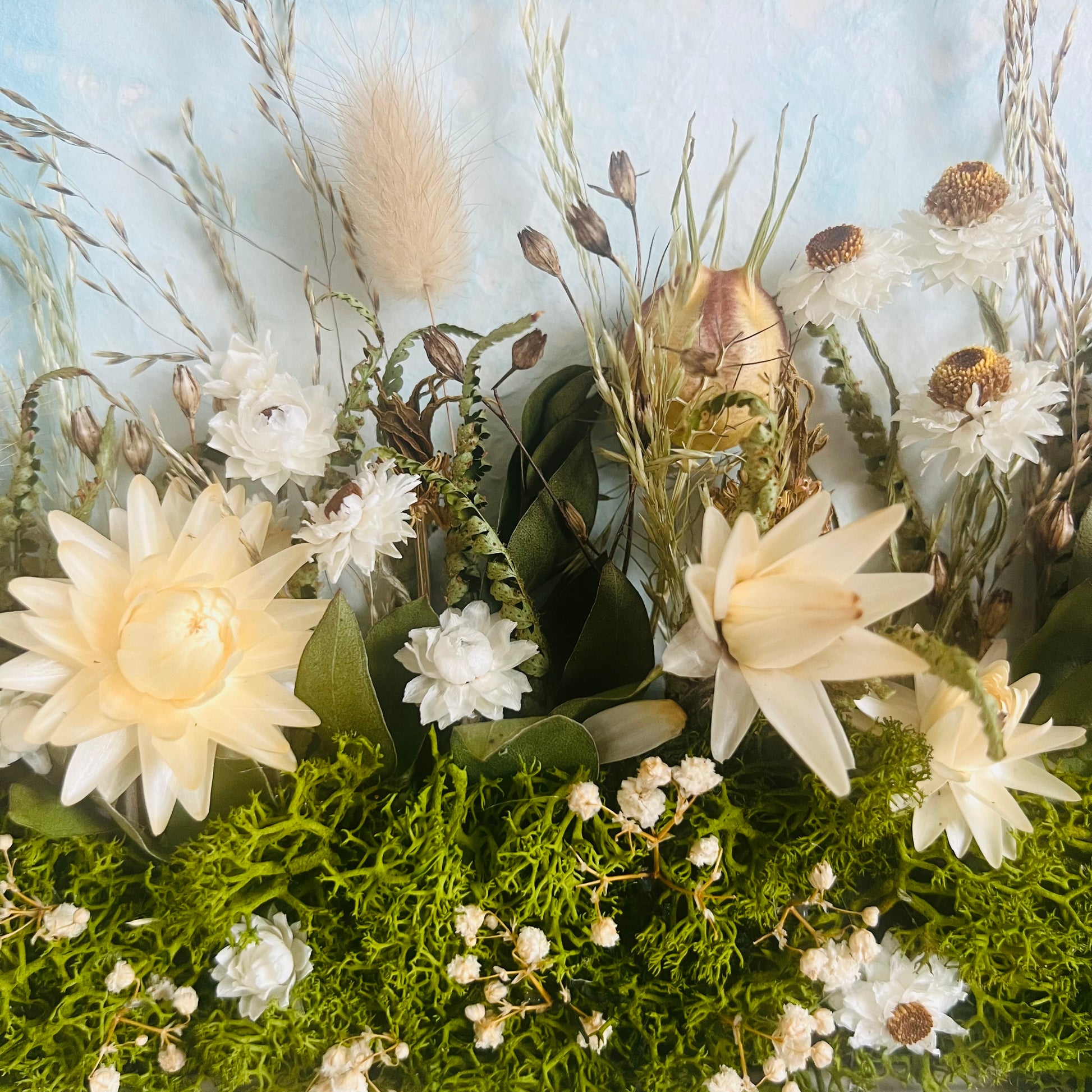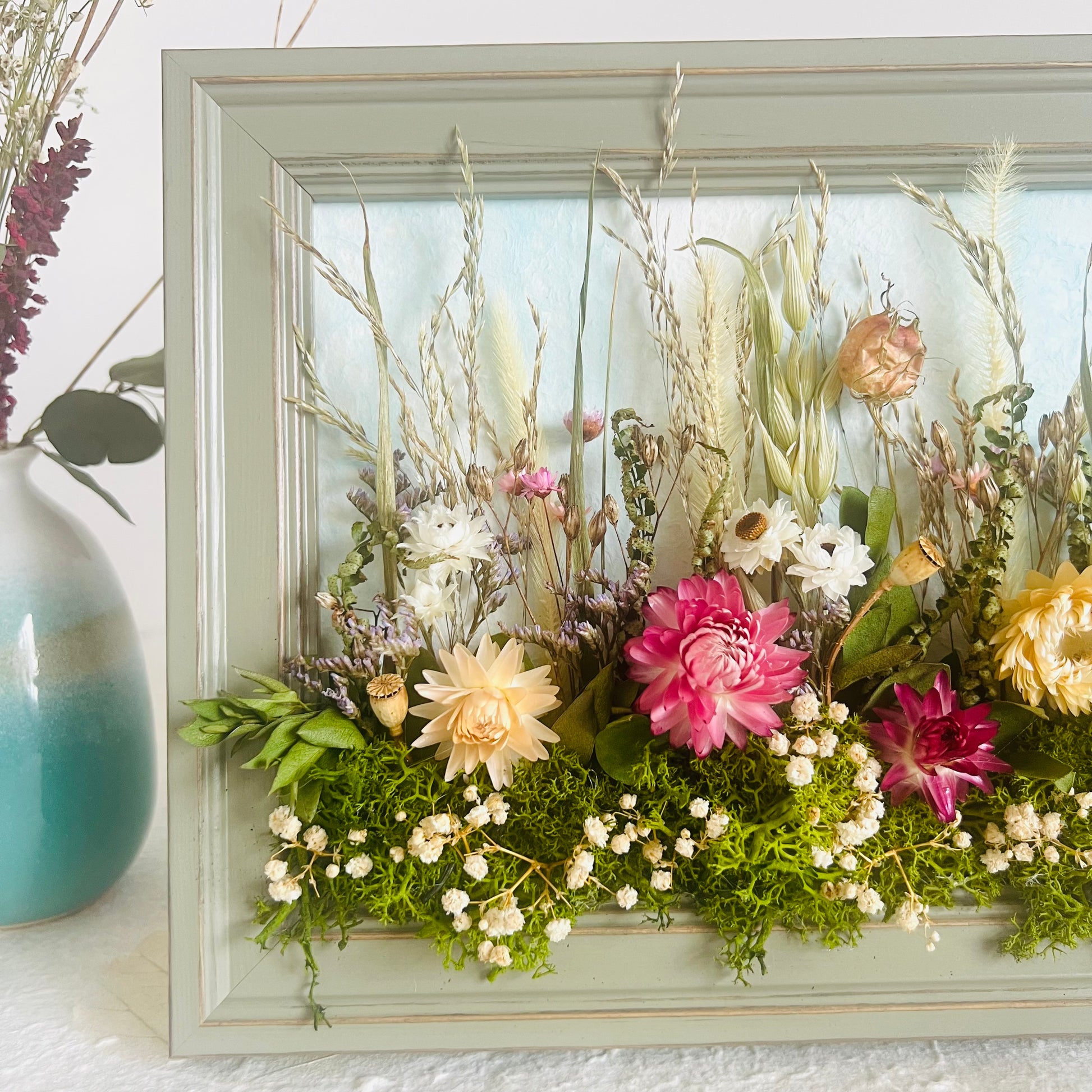 Each one is designed as a small landscape story, framed in rustic wooden frames that can stand or be hung on a wall. Grasses rise gently amongst flowers, seed heads and textural stems. The majority of the flowers are grown by local & Irish flower farmers, then carefully hand dried to retain their natural colour and form.