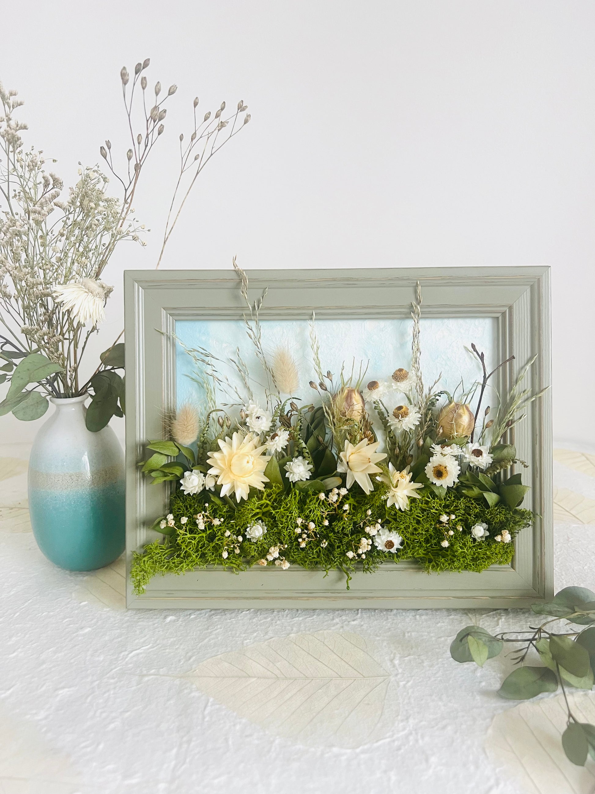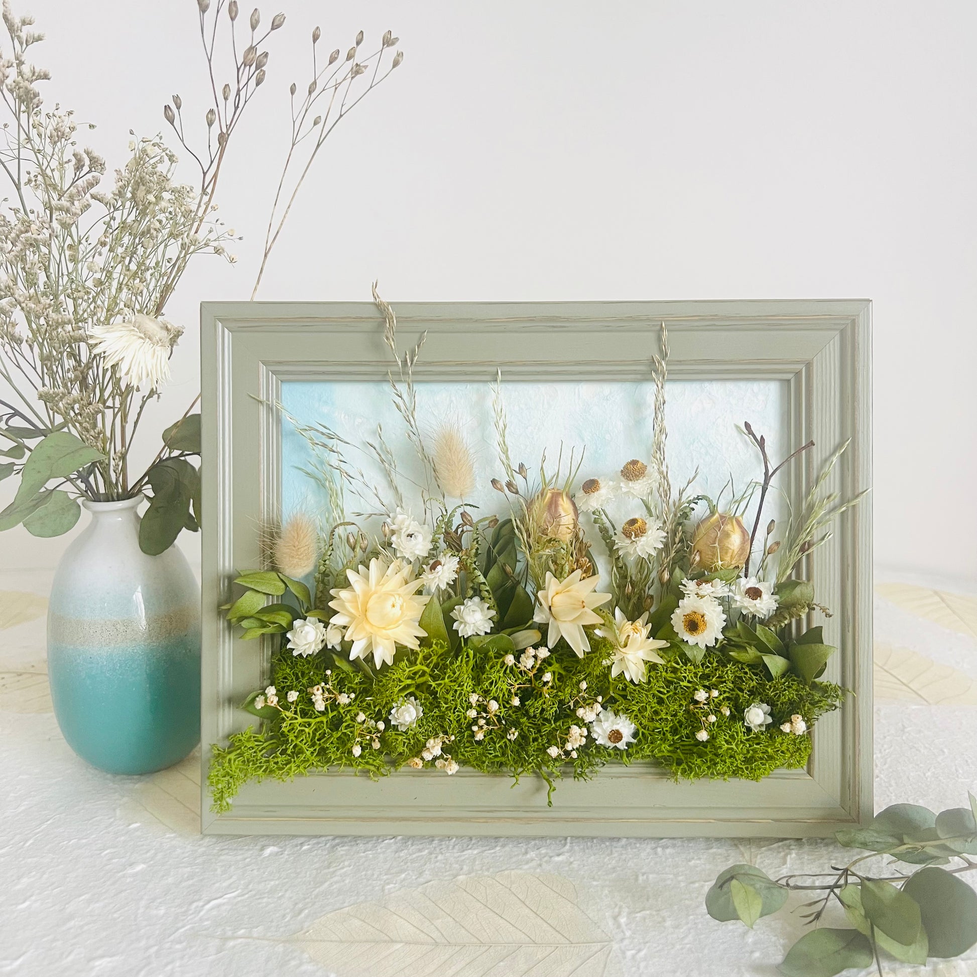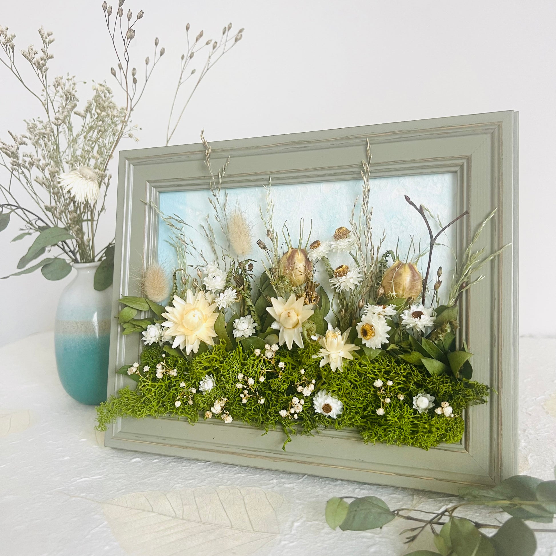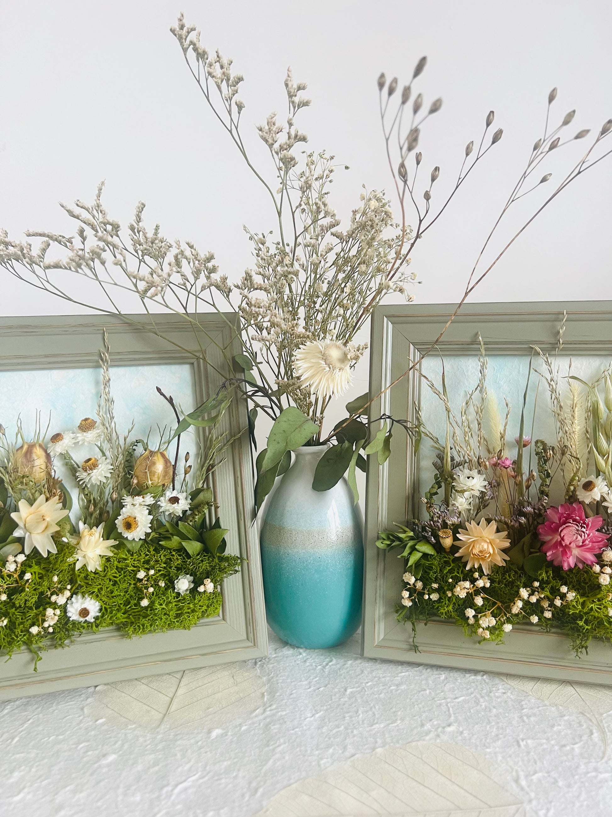 Each one is designed as a small landscape story, framed in rustic wooden frames that can stand or be hung on a wall. Grasses rise gently amongst flowers, seed heads and textural stems. The majority of the flowers are grown by local & Irish flower farmers, then carefully hand dried to retain their natural colour and form.