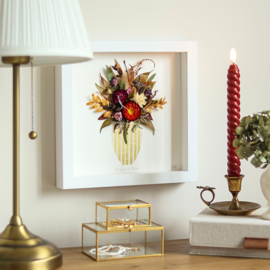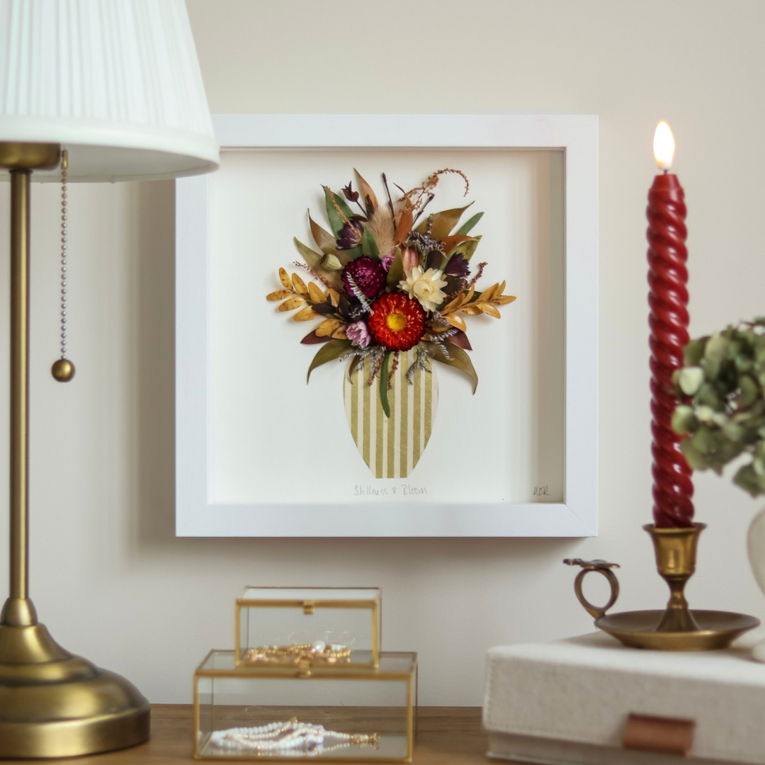 A beautiful Contemporary Floral Arrangement. Handcrafted using Irish grown, dried and preserved flowers and foliage and displayed in an Irish made wooden frame.