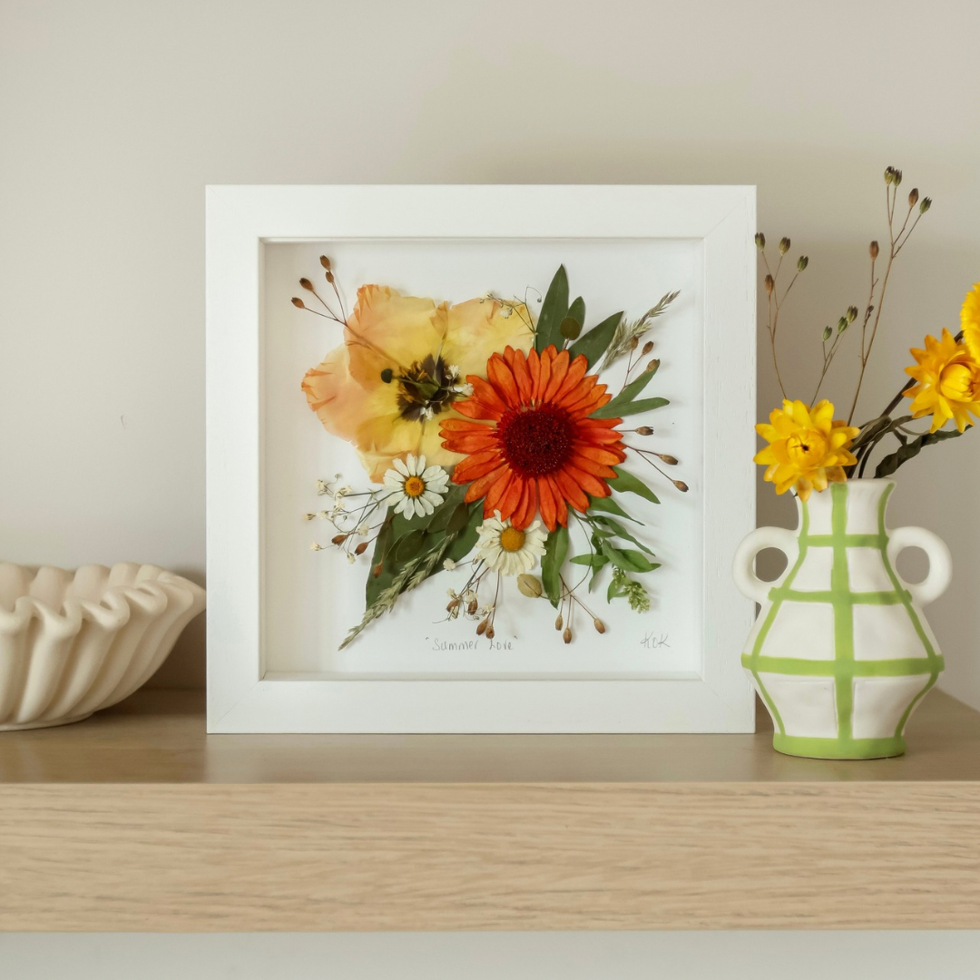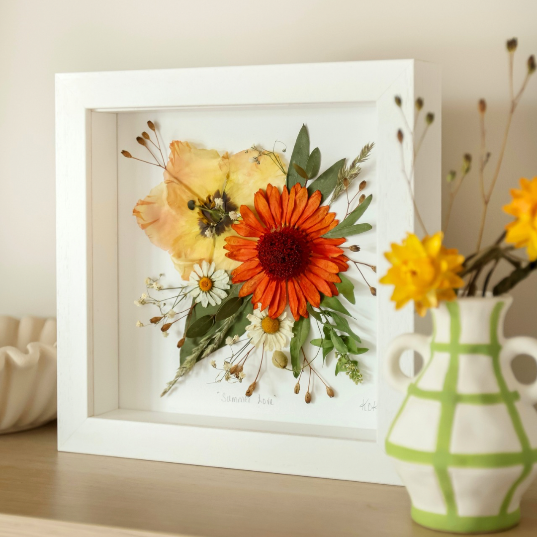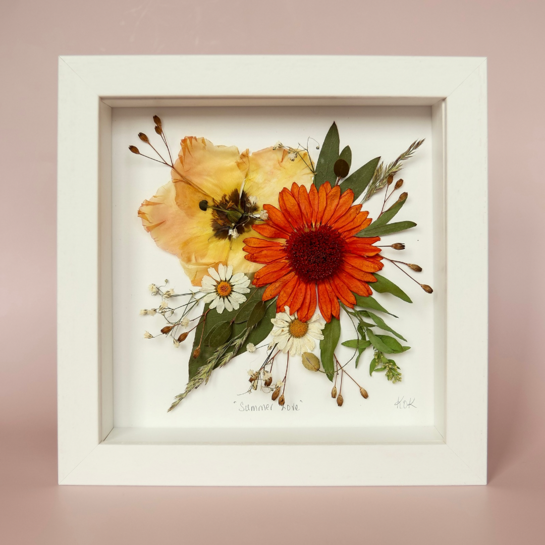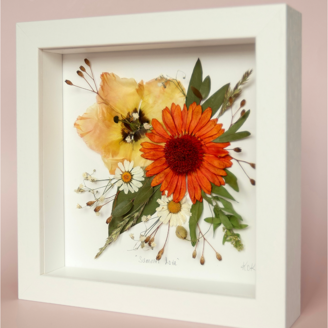 A beautiful Contemporary Floral Arrangement. Handcrafted using Irish grown, dried and preserved flowers and foliage and displayed in an Irish made wooden frame.